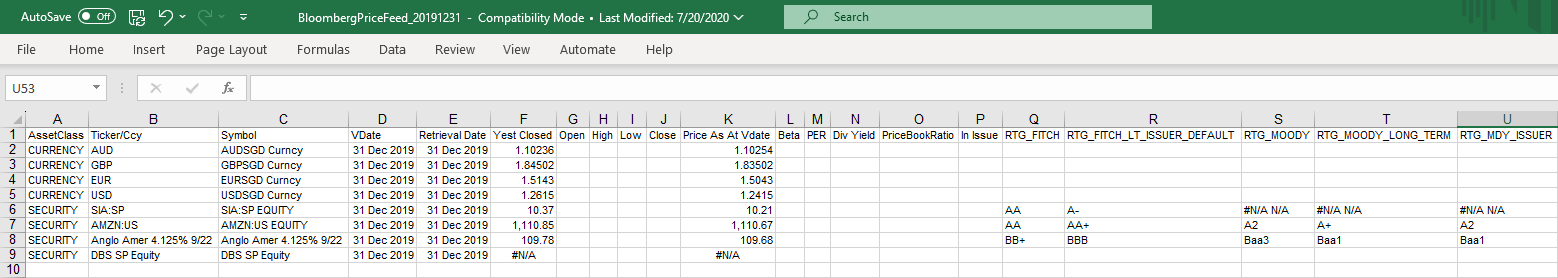 7. Open the saved file. The template would be already populated with all the available currencies and securities in the CS Lucas system.