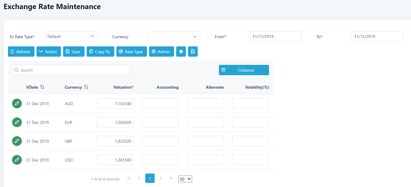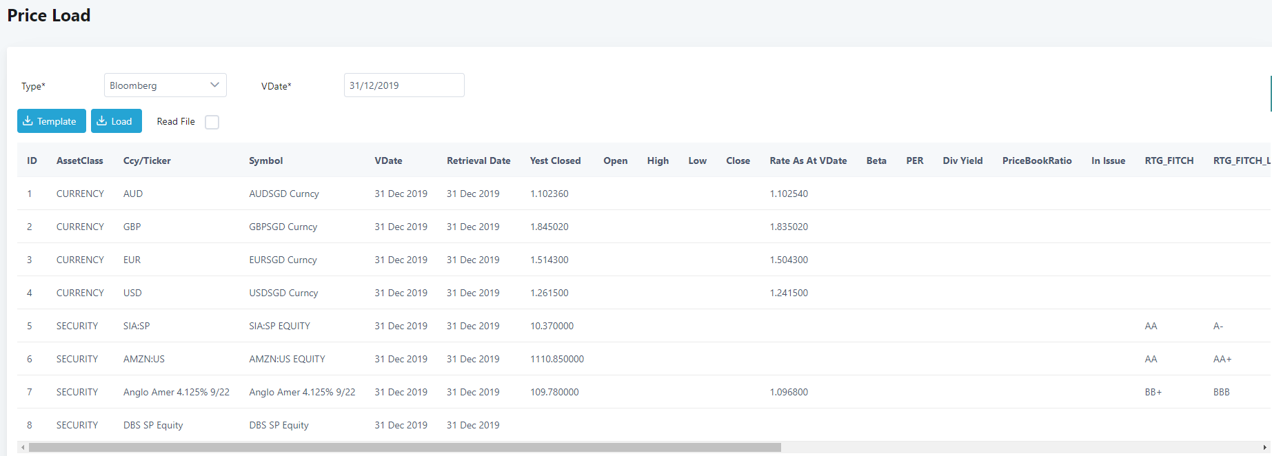 13. Click Load button to load the prices into the system. System will save the prices displayed in the “Rate As At VDate” column and any credit rating in the following columns.