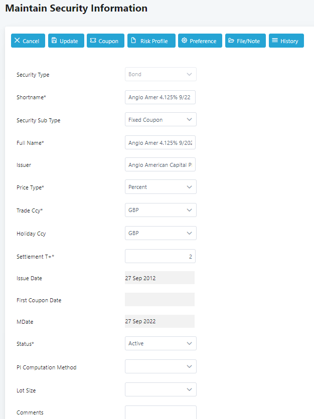 Navigate to Set Up > Static > Securities > Select the Security Type and click Refresh. Click on the security short name.