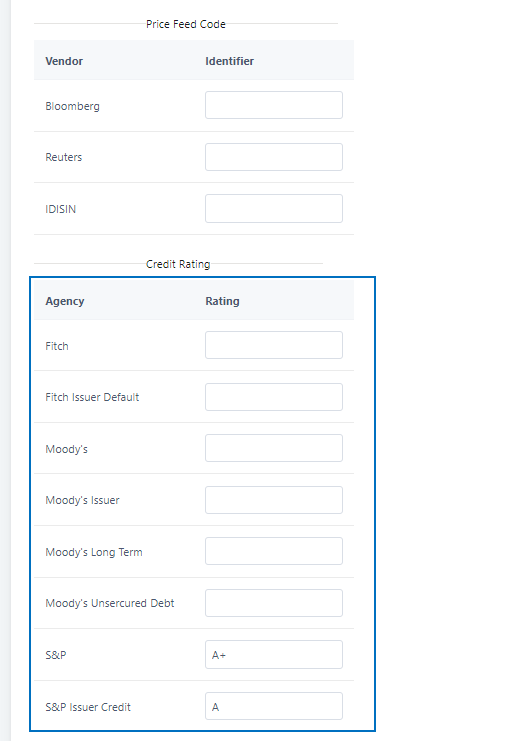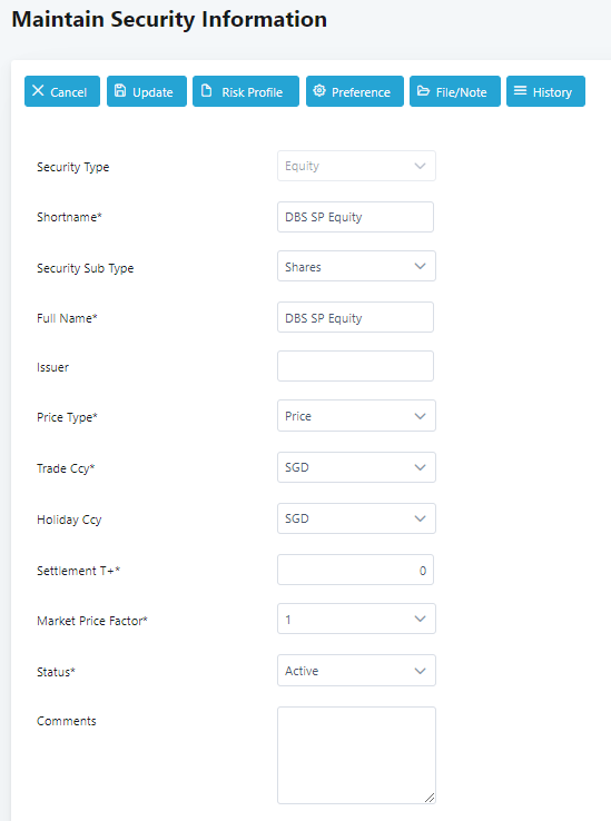 For security, it will display the Bloomberg Price Feed Code setup in the security details, for e.g., OCBCR2 EQUITY. If this is not available, then the shortname will be displayed with square brackets, for e.g., [OCBC RTS] |