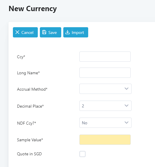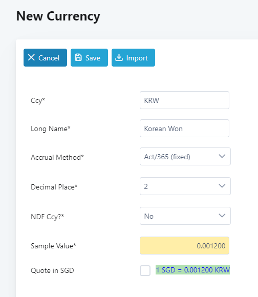 4. In the Ccy field, type currency to create. In this example, we will use KRW. Please note that this field, once created cannot be changed. It is recommended to use the International standard codes for currency.