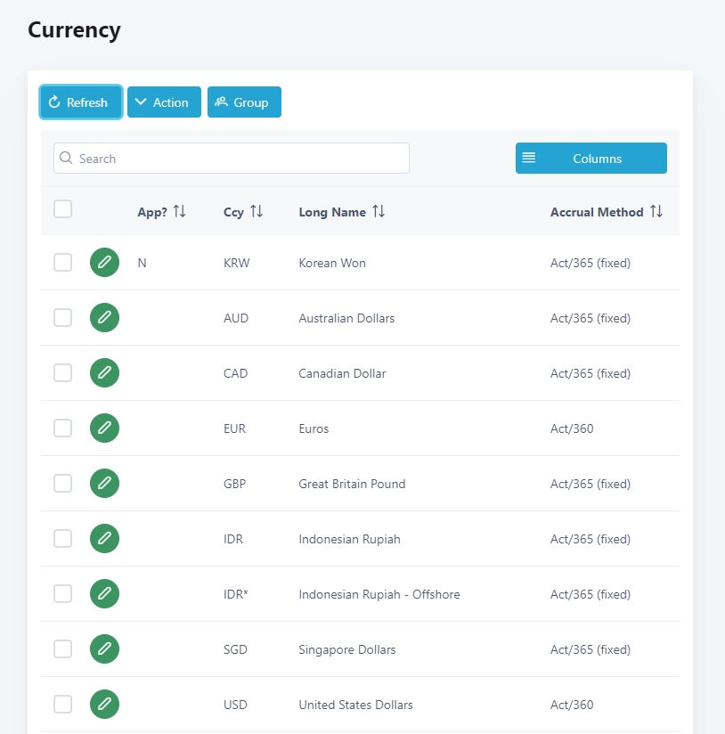 11. Click Save. The new currency will be created. Newly created currencies are unapproved indicated by “N” in the app field.