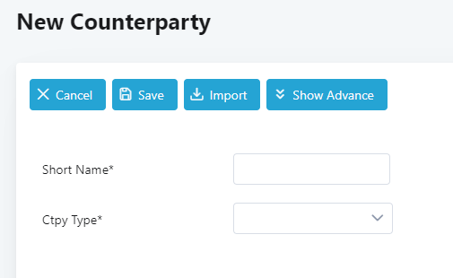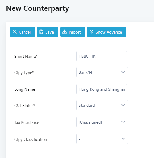 4. In the Short Name field, enter the short name you want to set up for this counterparty. For example, you may put HSBC-HK for HSBC in Hongkong.