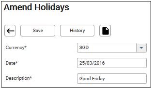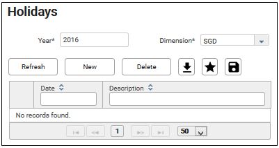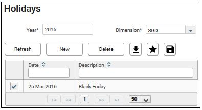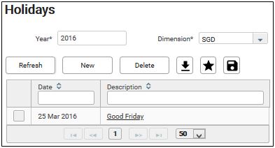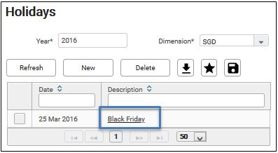 6. In the Holidays main screen, look up the Year: 2016 and Ccy: SGD.