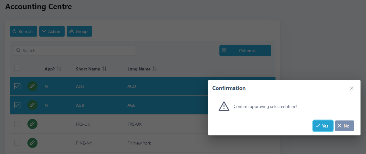 16. Click on Action and Approve . A popup appears to confirm, click Yes.