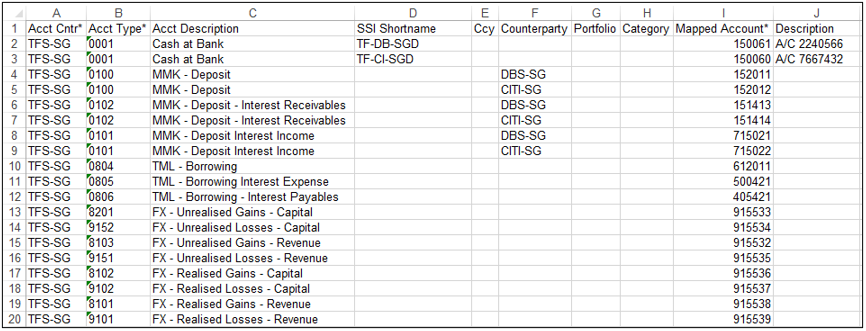 5. Input values as required. Fields marked with an asterisk are mandatory. The list of account types can be find here. For more information on the mapping dimensions, i.e. SSI Shortname, Ccy, Counterparty, Portfolio, see FAQ in Chart of Accounting Mapping.