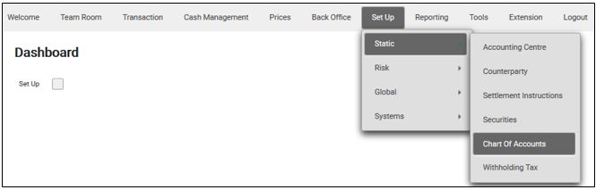 1. From the main menu, select Set Up > Static > Chart of Accounts.