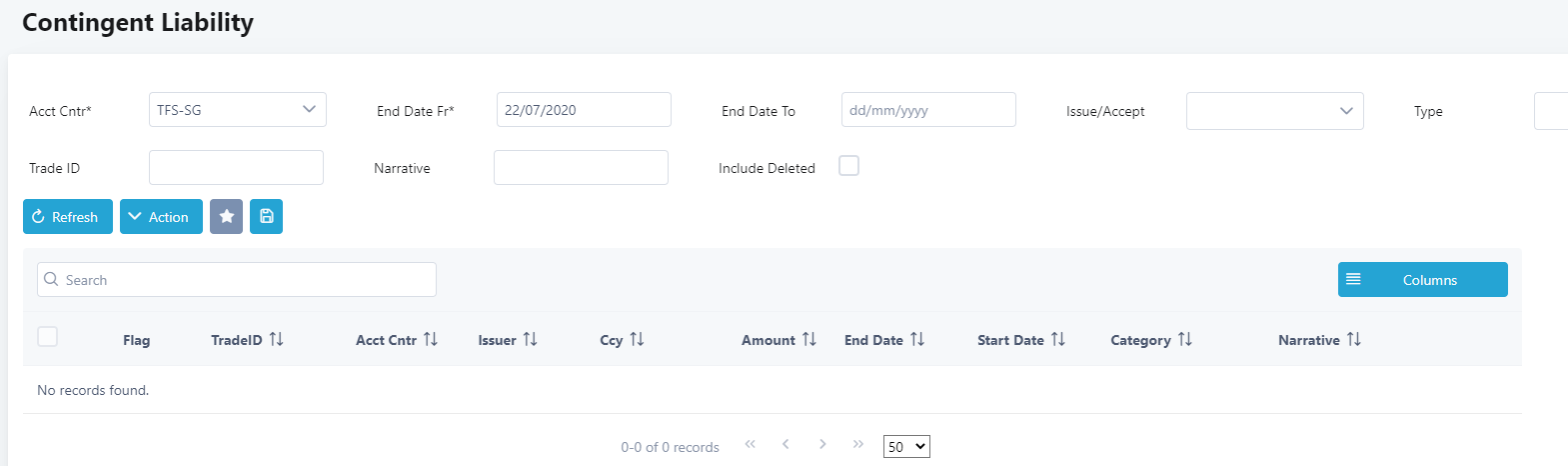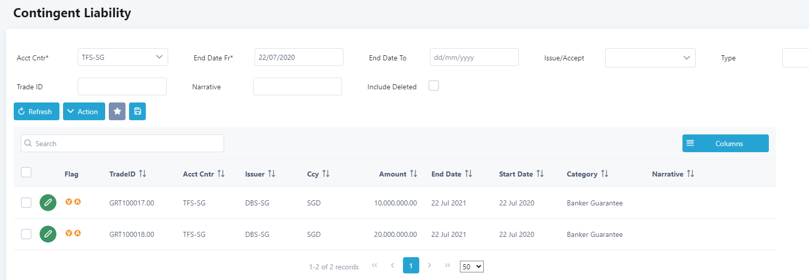 15. Click Cancel button to return to Contingent Liability screen. You will see the trades loaded appear in the trade listing.