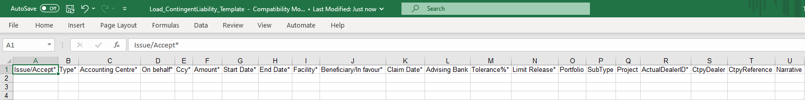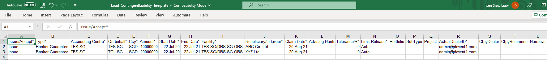 6. Fill out the fields on the Excel file. Fields with asterisk (*) are mandatory. For more information on each field, see Create and Amend Contingent Liability.