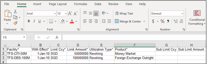 8. Input values in the Excel sheet. Fields with asterisk (*) are mandatory. For more information on each field, see how to create facility and limit .