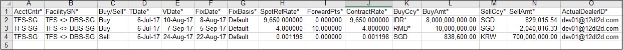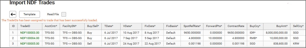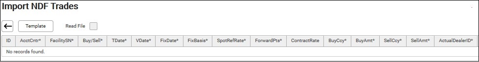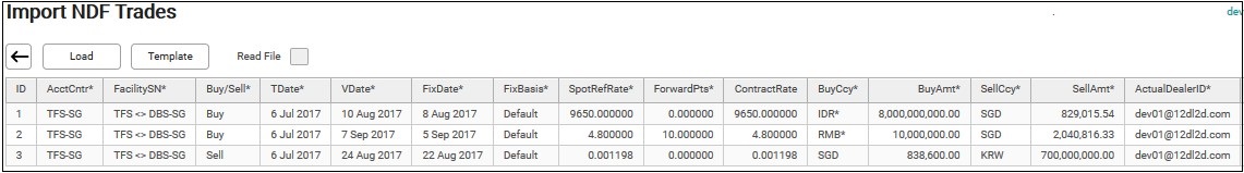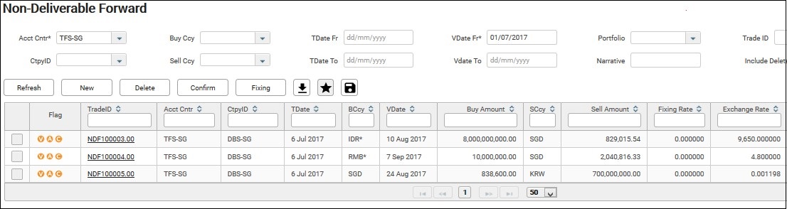 13. Click Back Button to return to the NDF screen. Filter by Acct Cntr and VDate Fr and click Refresh. The imported NDF trades will be displayed.
