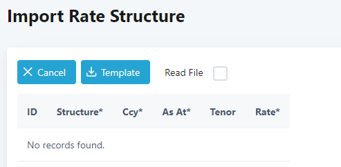 1. From the Maintain Rate Structure screen, click Action and select New, then click Import. The Import Rate Structure screen will be displayed.