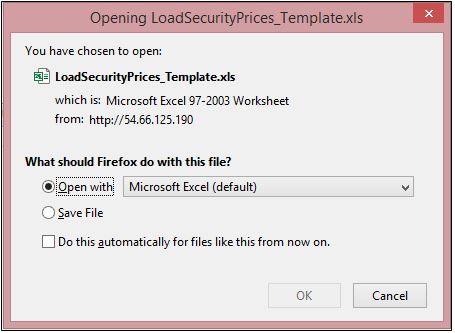8. Click Choose File. Look for the saved LoadSecurityPrices_Template.xls file.