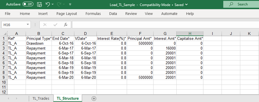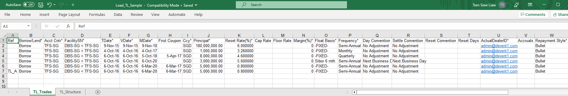 5. There are two tabs in the Load_TL_Template. They are “TL_Trades” and “TL_Structure”. If you wish to load the Term Loan transaction without a pre-set repayment schedule and wish the system to automatically generate the repayment schedule, fill in only the “TL_Trades” tab. If you wish to load Term Loan transactions with a specific repayment schedule, fill in both “TL_Trades” and “TL_Structure” tabs.