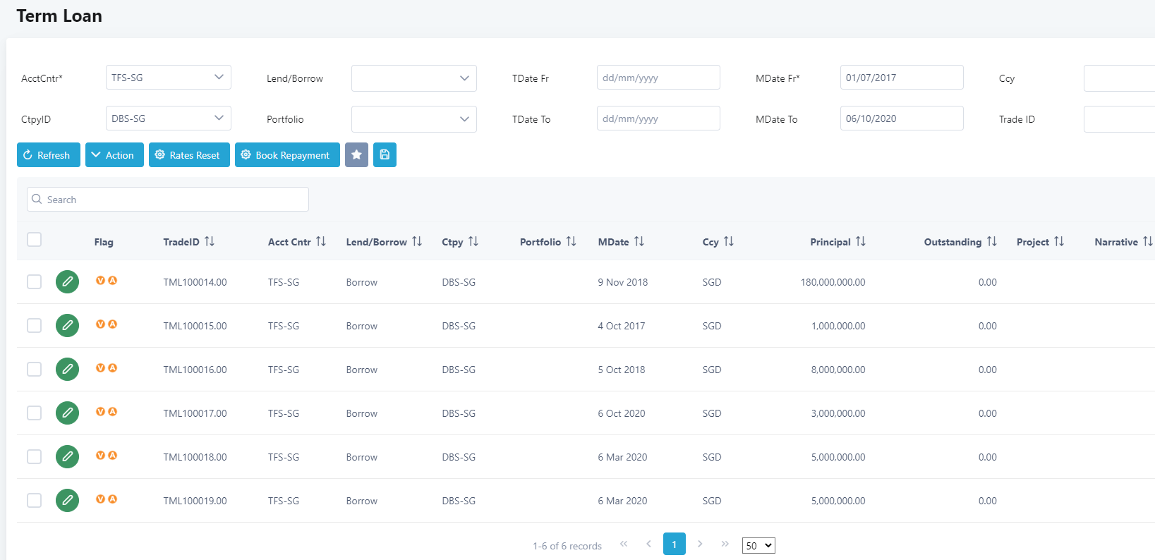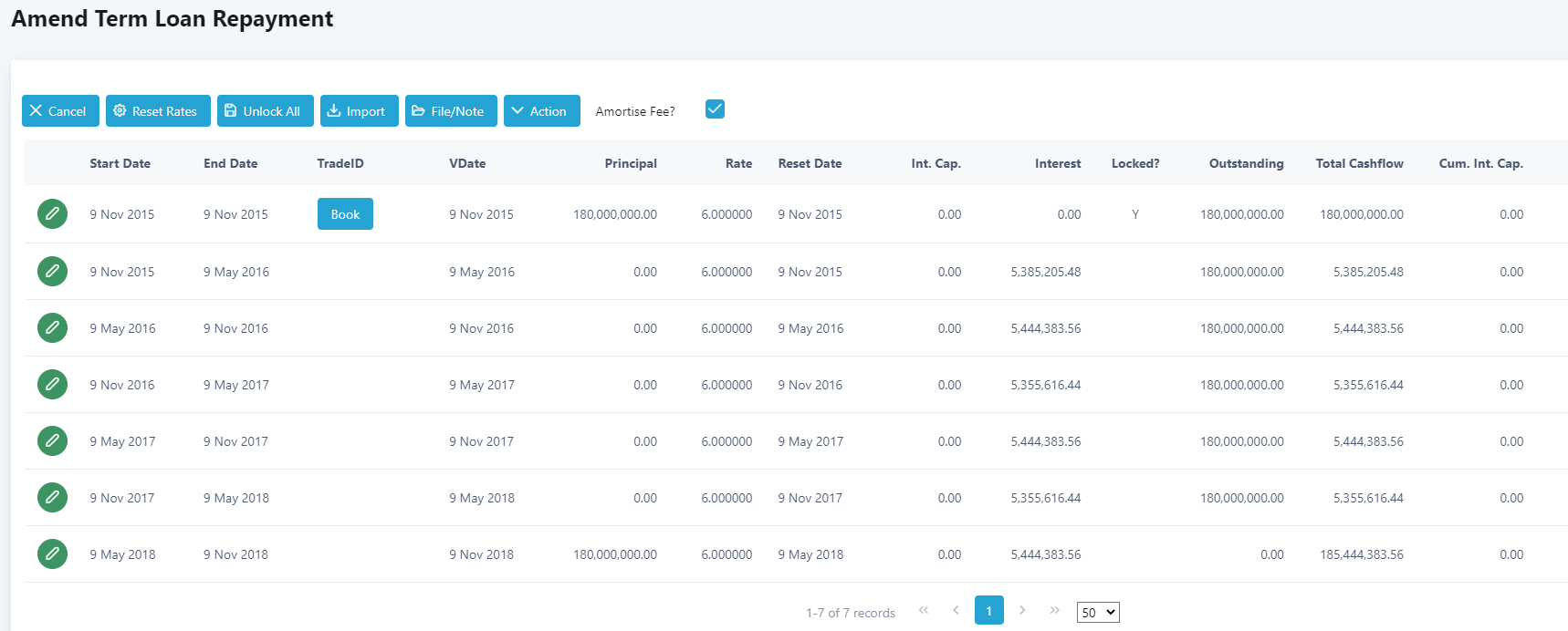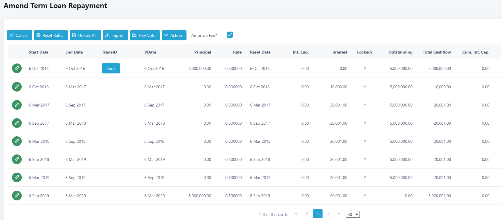 20. Click on the Edit button of TML100014.00, then click on Repayment. You will see the repayment schedule generated automatically by the system for this trade. Amend from this screen if any changes needed to be made after loading.