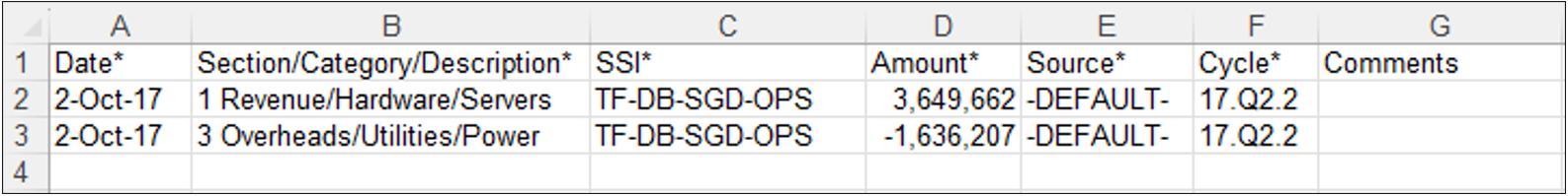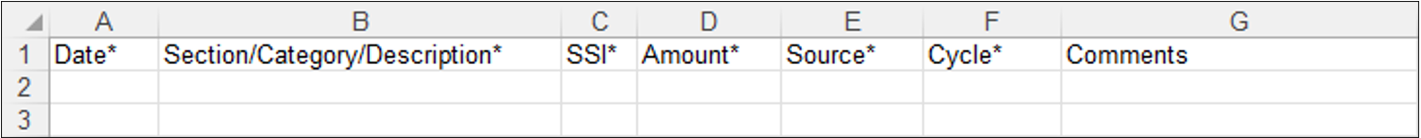 b) Invalid SSI, Date, Amount, Section/Category/Description, Cycle and Source. Ensure SSI, Section/Category/Description, Cycle and Source are valid and exist in the system. Ensure Date and Amount format are valid.