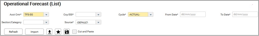 16. From the Operational Forecast (List) screen, select the appropriate fields Acct Cntr, Ccy/ SSI, Cycle, From Date, To Date and Source to filter out the forecast and click Refresh. The forecast imported will be displayed.