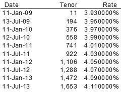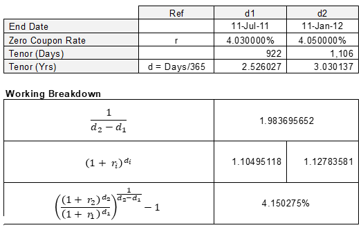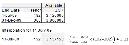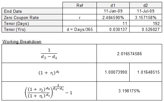 The rate of 3.157158% is then used as in Example 1 to compute the forward rate between 11 Jan 09 and 11 Jul 09.