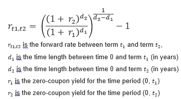 The forward rate is the future yield that can be implied from the prevailing zero coupon curve. The formula is given as: