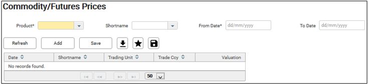 8. Click Refresh. The Commodity or Futures prices added for the date specified will be displayed. System will set the To Date to same as From Date if this is left blank. If you need to view for a specific date range, the commodity/ futures short name must be selected.