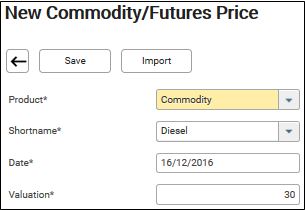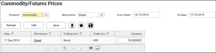 6. Click Save. The valuation price for commodity “Diesel” is added. You will be returned to Commodity/Futures Prices page.