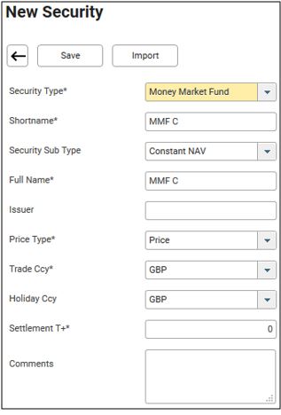 3. Select the Security Type as Money Market Fund. See below example. For more information on the explanation for each fields, see user guide for security set up.