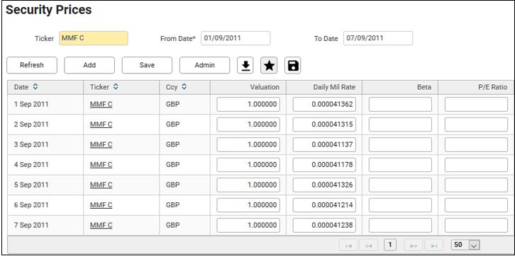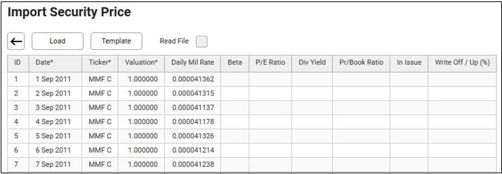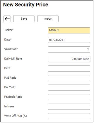 4. Input the Ticker short name, Date, Valuation price set to 1 and the Daily Mil Rate.