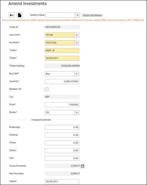 30. The investment trade booked from reinvestment of MMF from the MMF Interest screen cannot be amended or deleted in the Investment screen.