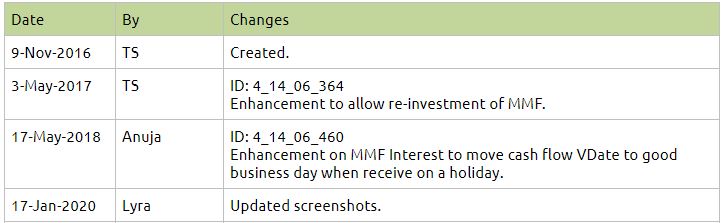 This document is a step by step guide on how to create Money Market Fund (MMF) security, maintain MMF daily mil rates, buy/ redeem MMF and interest and reinvest MMF.