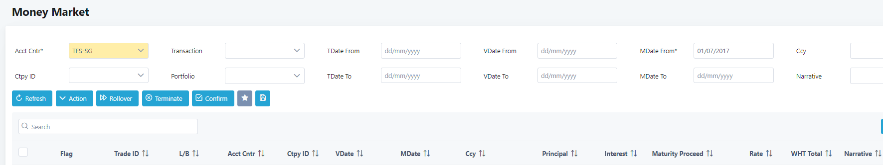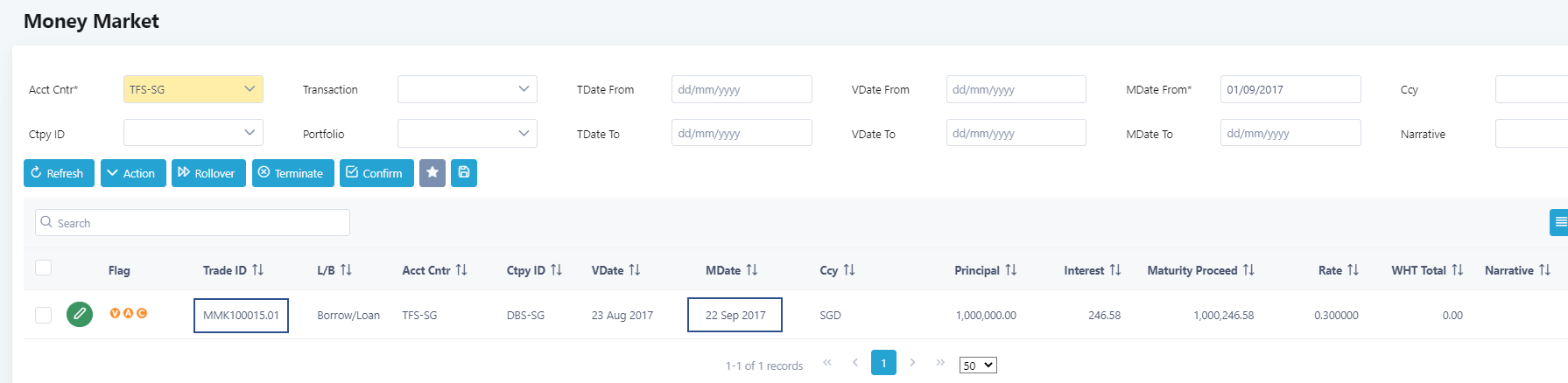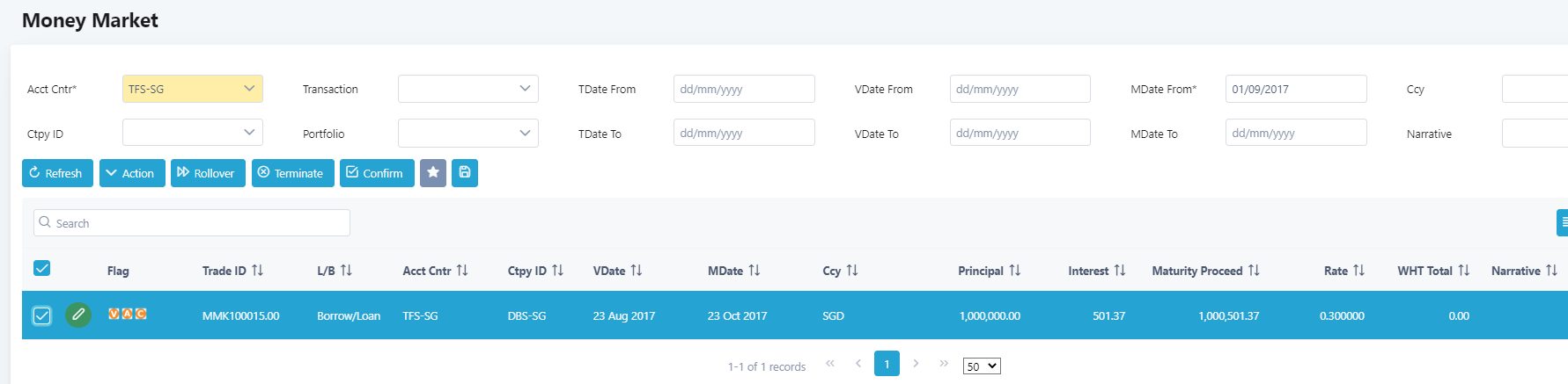 4. Choose the money market transaction to terminate by ticking on the checkbox beside the trade ID. In this example, MMK100015.00 will be selected.