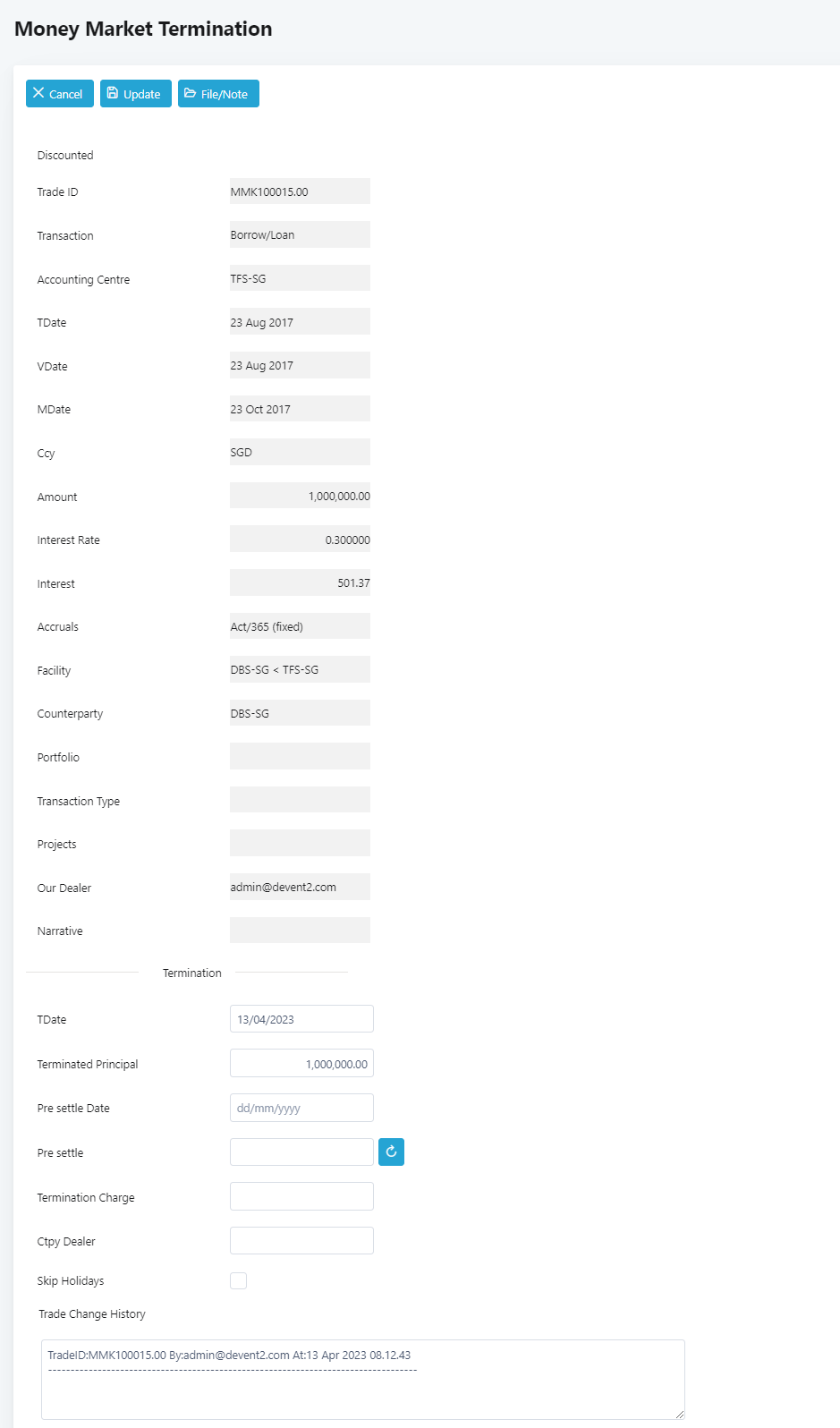 11. System will update the trade and the trade ID will be changed from MMK100015.00 to MMK100015.01. The Maturity Date will also be changed to the pre settle date that was inputted in the termination transaction.