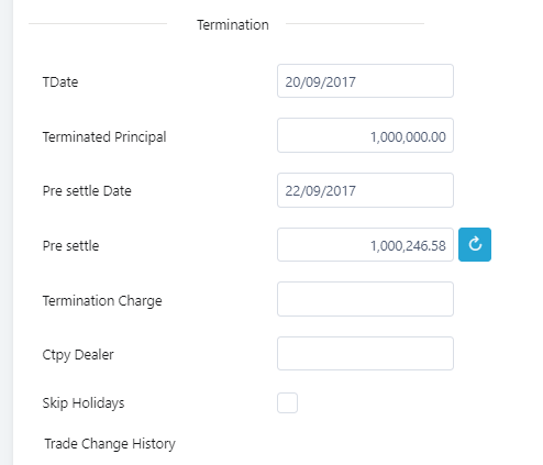 6. Under the Termination section, fill out the Pre Settle Date or when the money market will be terminated.