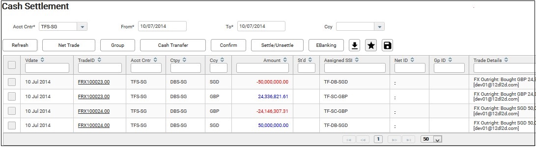 3. To net trades, click on Back Office from the menu and then select Cash Settlement. From the Cash Settlement screen, select the accounting centre and filter from date and to date to the same day, i.e. 10-Jul-2014. Click Refresh, you will see all trades that are value on the date filtered.