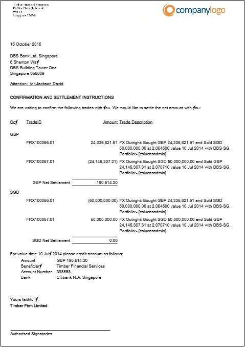 9. In the Foreign Exchange module, filter the trades and then select one of the Foreign Exchange trades and click Confirm. The system will generate a letter as below.