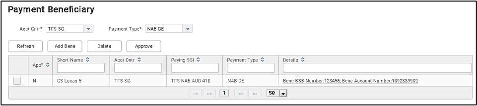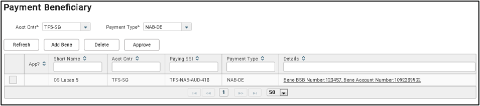 5. To view the details for a particular payment beneficiary, click on the Details hyperlink to drill down to Amend Payment Beneficiary screen.