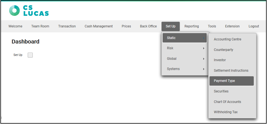 Tip: If you do not see the Payment Type in the menu navigation, please ensure that you have the access rights to access this screen. Access rights required is 19600 Access Payment Type.