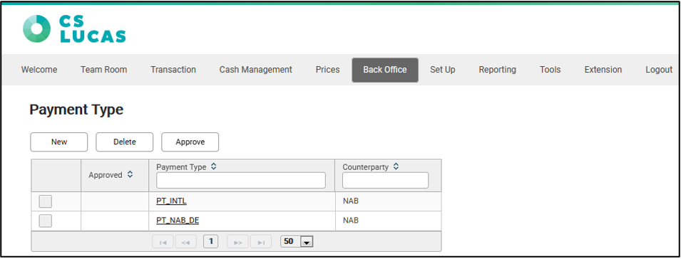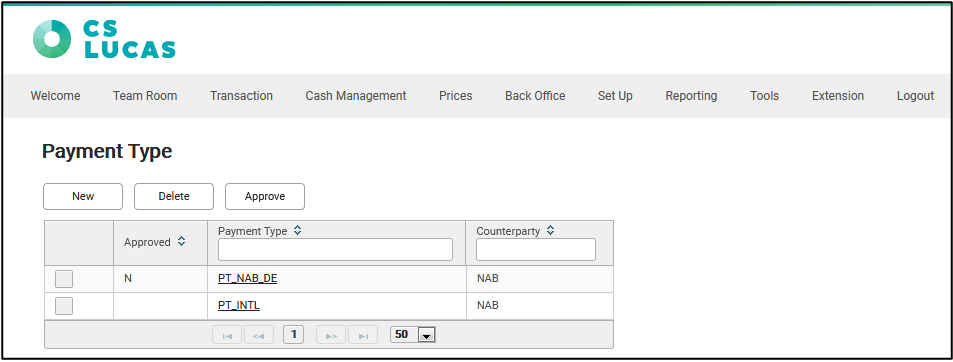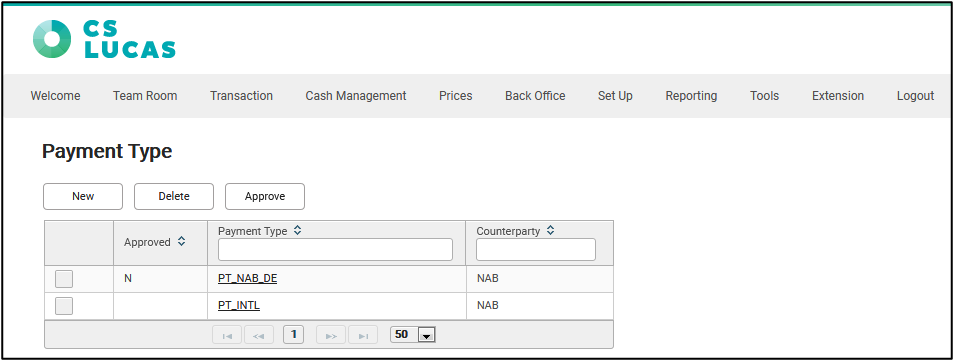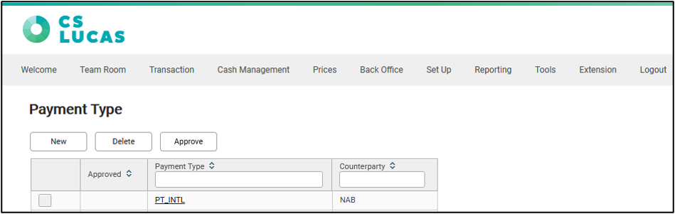 10. New payment type created is saved and appear as not approved in the Payment Type listing screen.