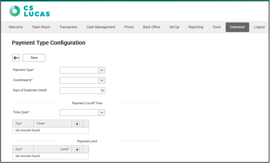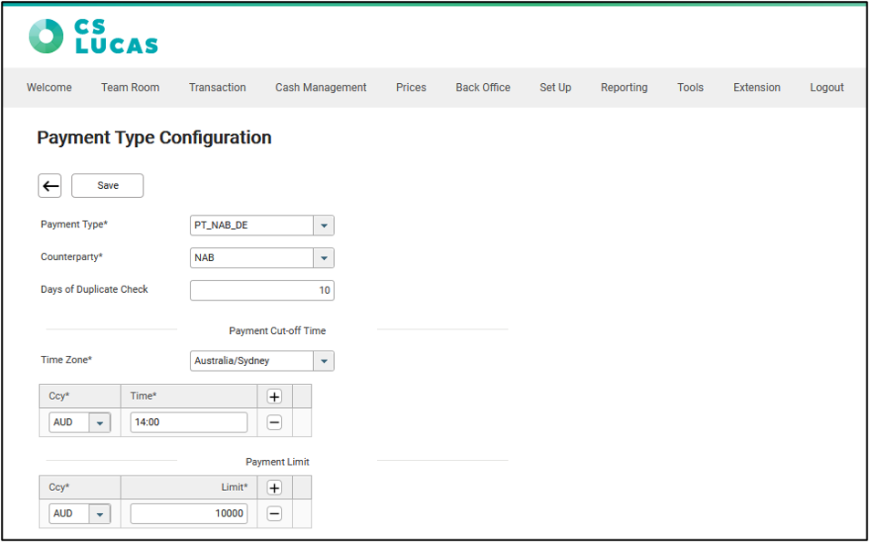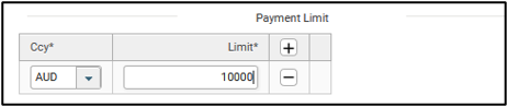 6. To set payment limit, click + to add a new row item. Select the payment limit currency and enter the limit amount. If the limit is not for a specific payment limit currency, choose Default for the Ccy. To remove any row item, click -.
