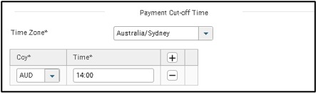 5. To set payment cut-off time, select the Time Zone and then click + to add a new row item. Select the currency and enter the cut off time for the payment currency. To remove any row item, click -.