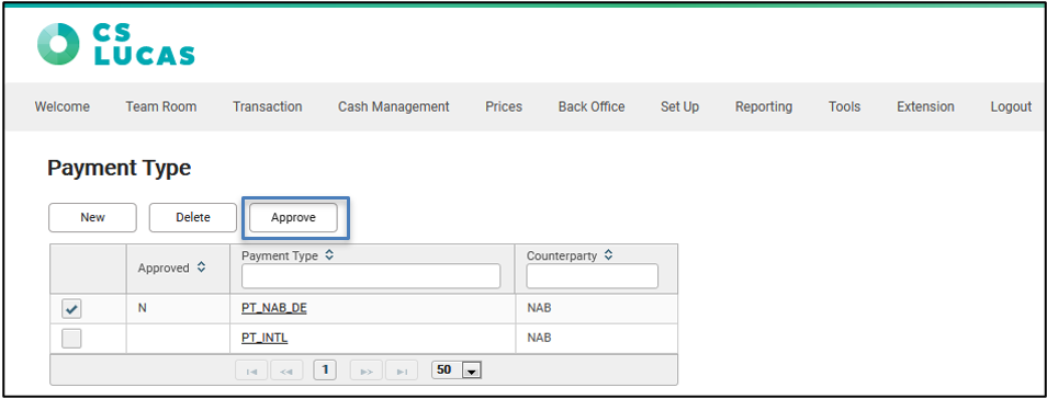 11. To approve, tick on the checkbox of the newly created payment type and click Approve.