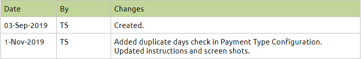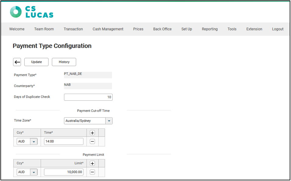 14. Amend accordingly and click Update when completed. You will be returned to Payment Type screen.