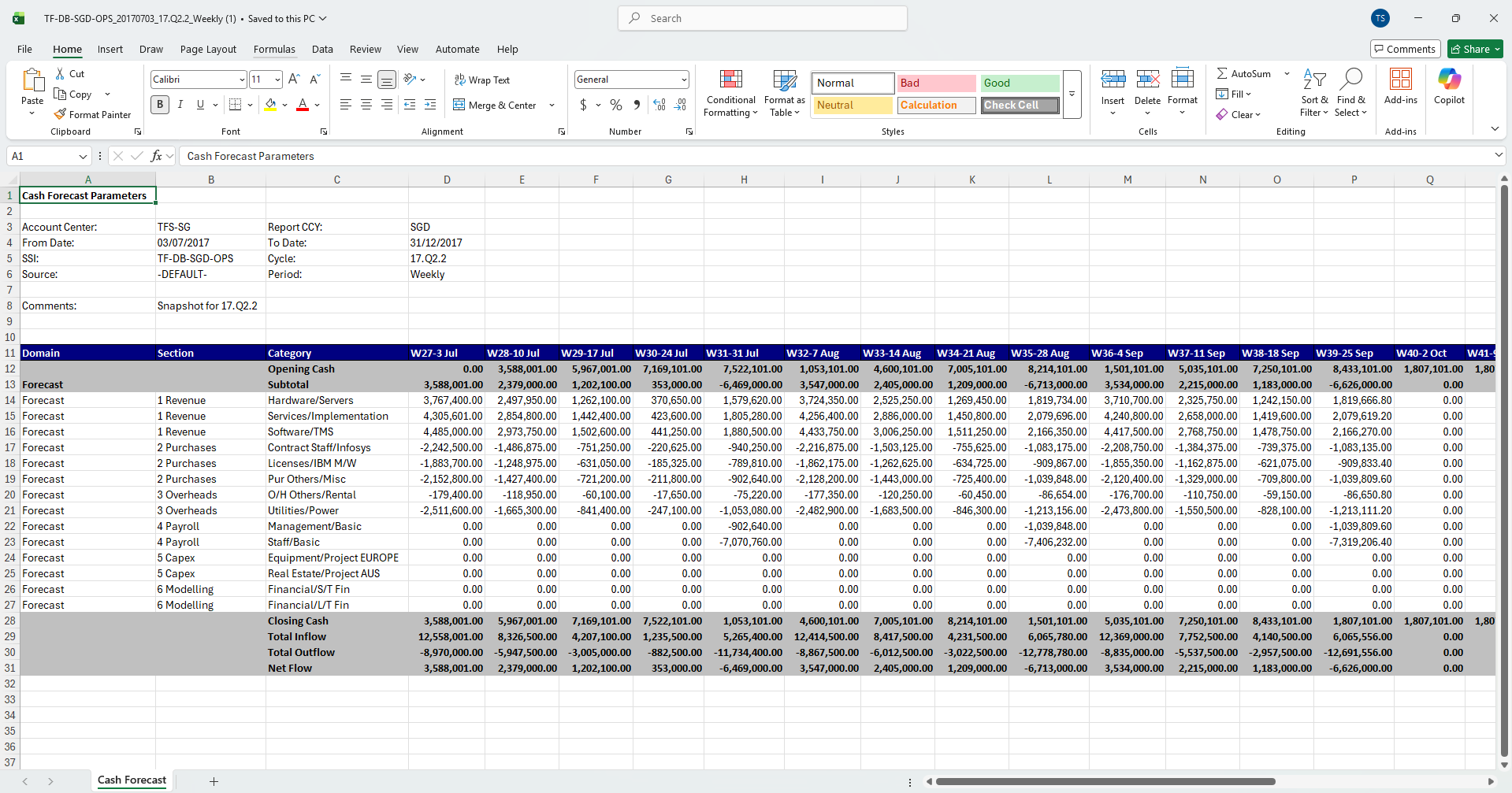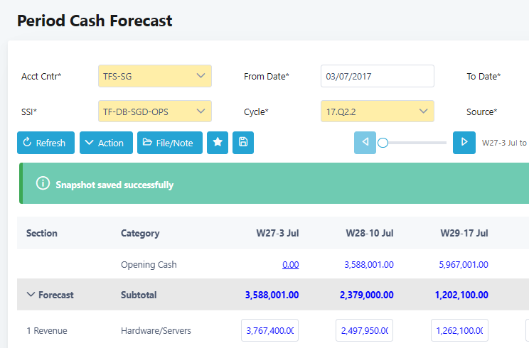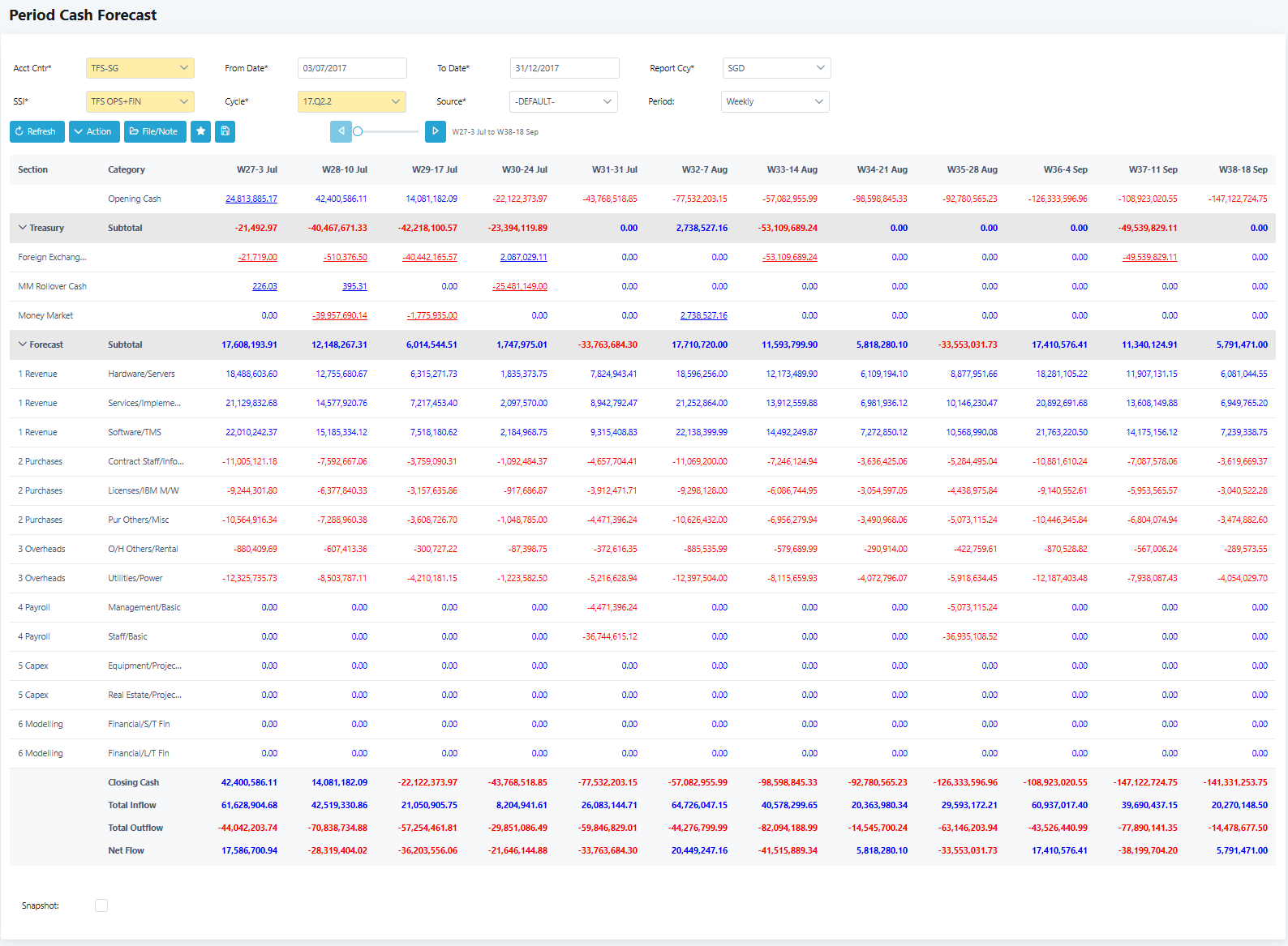 10. After all mandatory fields are filled in, click Refresh and the screen below displays. In this example, it shows a weekly cash projection by SSI group from 3-Jul-2017.