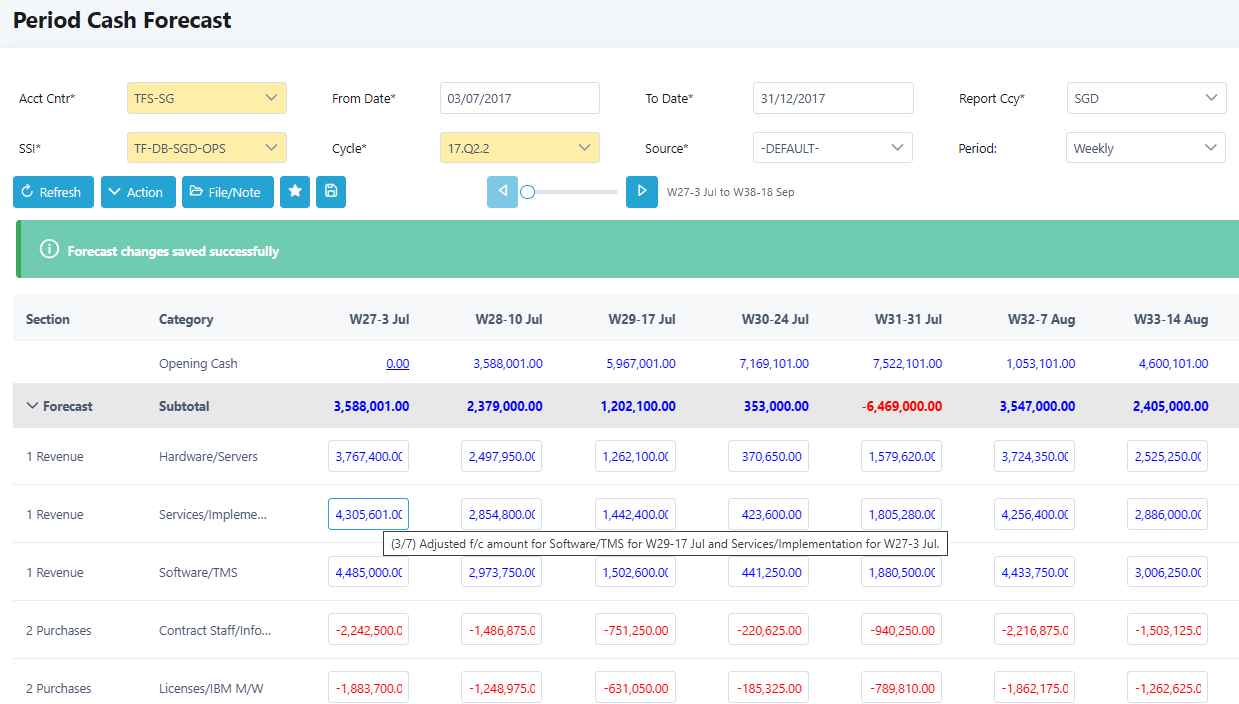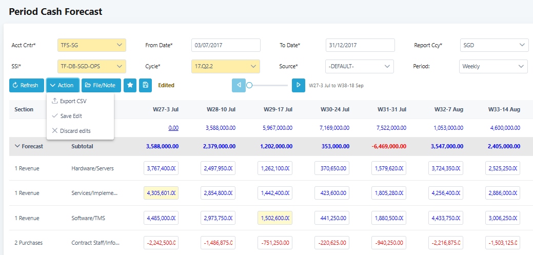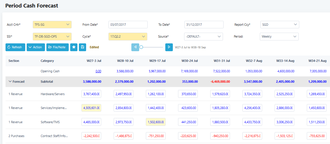 12. The forecasts are uneditable if the cash projection is viewed by accounting centre group or SSI group. To allow editing forecasts, please ensure you select a specific accounting centre, SSI and ensure the reporting currency is set to the same as the SSI currency. Only forecasts within the period dates of the forecast cycle selected can be edited.