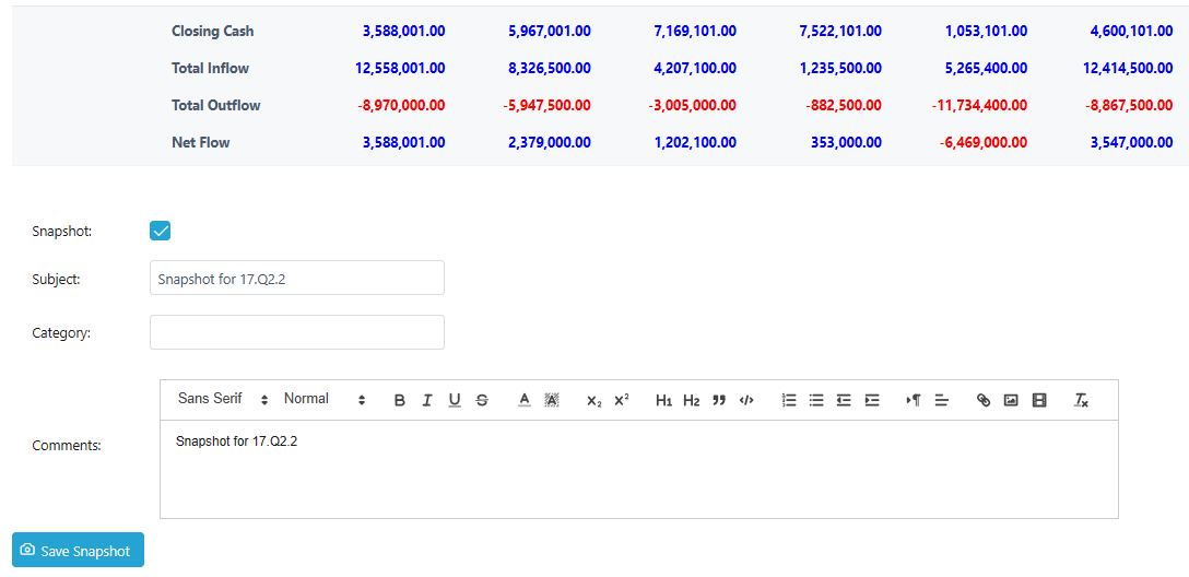 19. To take a snapshot of the cash projection, check the Snapshot checkbox at the bottom left of the screen. Enter a subject, enter any comments and click Save Snapshot. At the confirmation pop-up prompt, click Yes.