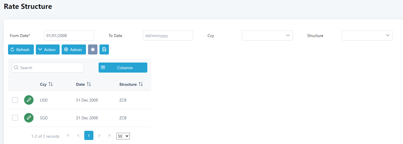 3. Click on Admin. The Rate Structure Administration screen displays.