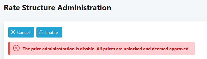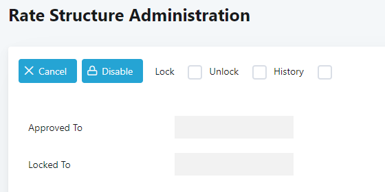 11. To disable rate structure administration, click on the Disable button. Once disabled, all rate structures are unlocked and when the rate structures are updated, they are deemed approved.