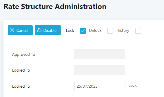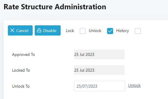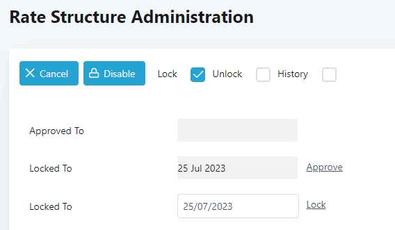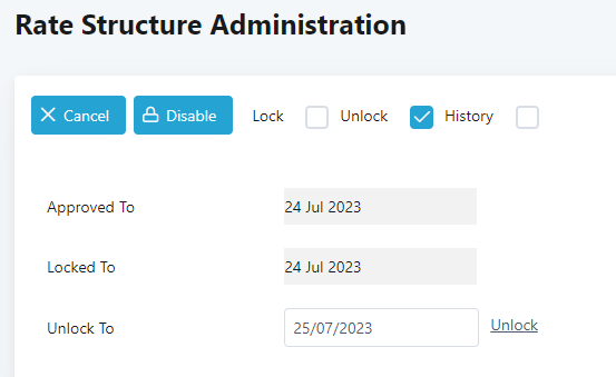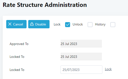 9. Click on the Unlock hyperlink beside the date. Locked To date and Approved To date will be updated to one day before the Unlock To Date. This means you can make changes to rate structure from 25 July 2023 onwards.