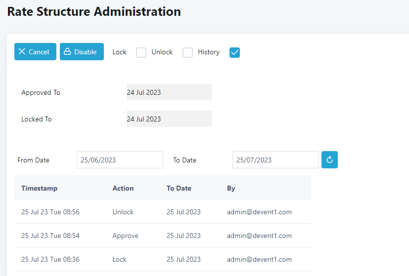 10. To view the system audit logs for when rate structure is locked and approved, tick on the History checkbox to see the logs for one month as default. You may also change the From Date and To Date to see logs for other dates.