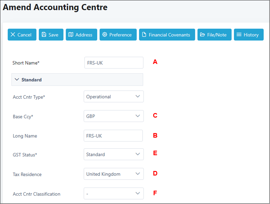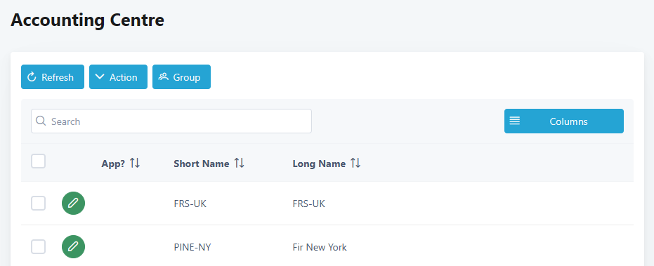 2. Click the Edit button next to the short name of the accounting centre. In this example, FRS-UK.