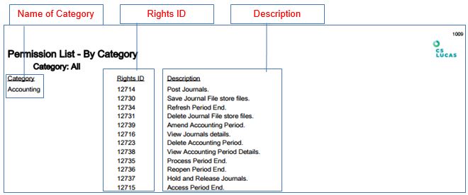 To provide the Rights ID and Description used by CS Lucas sorted by Category.